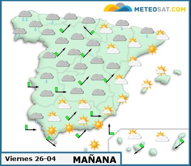 Se prevé que una baja atlántica se acerque al noroeste peninsular, dejando un aumento progresivo de la inestabilidad en la Península y Baleares, con cielos nubosos o cubiertos que se irán extendiendo de noroeste a sureste y acabarán por afectar a la mayor parte del territorio, menos probablemente al extremo sureste. Se darán precipitaciones en Galicia y Cantábrico, tendiendo a intensificarse por la tarde, extendiéndose al resto del extremo norte y tercio noroeste peninsulares, y pudiendo ir acompañadas de tormenta y granizo. No se descarta que lleguen a localmente fuertes en Galicia y oeste de Asturias. También son probables los chubascos ocasionales por la tarde en otras áreas de la mitad norte, interiores del levante y ocasionalmente en Baleares, donde igualmente podrían darse a primeras horas del día. Al final del día no se descartan tampoco precipitaciones en el extreo suroeste peninsular. La cota de nieve se situará en 1400/1800 metros en las montañas del norte. En Canarias, intervalos nubosos en el norte de las islas de mayor relieve y poco nuboso en el resto, sin descartar algún chubasco ocasional en zonas de interior.